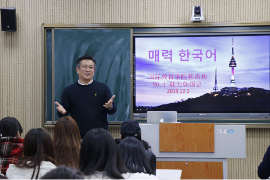 本次韩语角活动的主题是“魅力韩国语”,由韩国人气外教白炅翰老师主讲,学生参与互动的形式进行。白老师从衣食住行中的韩国语和韩国文化为主要内容,给同学们上了一堂生动有趣的韩国语课。通过俗语和经典小故事让同学了解了韩国语的独特魅力。其中,韩国人的礼仪文化和饮食文化让同学们感受到了“东方礼仪之国”的韩国传统文化的魅力,也提高了自己学习韩国语的积极性。在最后的互动环节,同学们踊跃发言,白炅翰老师也兴致高涨,给大家播放了一首韩国传统民谣《阿里郎》,整场活动在悠扬动听的旋律中结束了。