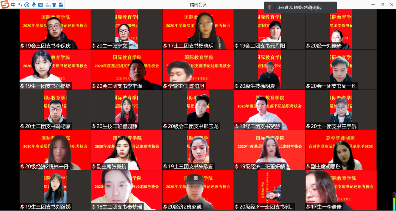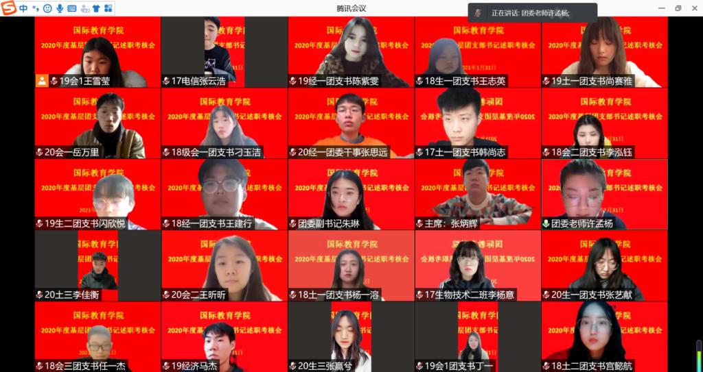 为贯彻落实团中央《关于在全省集中开展基层团组织书记述职评议考核工作的通知》(豫团组通字[2021]2号)精神和全面从严治团要求,激发基层团组织活力,提高工作部署的落实成效,2021年1月31日,kaiyun登录中国入口登录团委采用线上述职方式开展基层团支部书记述职考核工作。学院团委老师许孟杨、各团支部书记以及分团委组织人员参加此次述职工作,会议由学院分团委副书记朱琳主持。