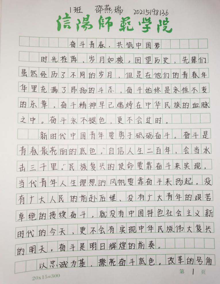 为回顾历程、总结历史、传承文化、怀念感恩、发扬精神,在全校营造浓厚氛围‘展现新中国成立以来的伟大成就,弘扬爱国主义精神和民族精神,深入推进社会主义核心价值观建设,激发学生奋发成才、报效祖国的热情。2021年11月15日,kaiyun官网通过线上征稿,开展了“奋斗青春,共筑中国梦”征文大赛活动。最后经过认真筛选,挑选出部分既书写美观,又内容丰富深刻的优秀作文进行展出。