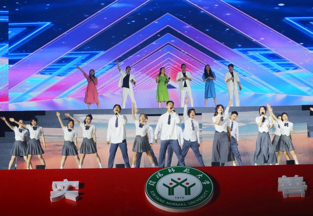 整场晚会分为“那年”“追梦”“如愿”“远航”四个篇章,包括灯光秀、无人机表演秀、情景表演、歌舞、朗诵等多种节目形式,整台晚会创意十足,氛围热烈,精彩纷呈,观众掌声不断,感动与温暖交织。先导片《你好,信阳师范大学》带领大家在光影中回顾我们曾经走过的壮阔征程。夜幕降临,无人机缓缓升空,伴随着欢欣鼓舞、热切激昂的音乐,机群不断变换校名、校训、标志性建筑图案,与“我爱你信阳师范大学”等深情表白交替呈现,震撼的画面引来师生阵阵欢呼。情景表演《点名啦》与情景讲述《风华》紧密衔接,全体观众代表3万多名师生、30多万名校友齐声点名答“到”的呼声响彻校园。来自1975级、1979级、1999级、2019级四位校友代表向培养自己的母校深情告白,表达对母校的感恩与祝福。我校2000级音乐学专业毕业生、中国歌剧舞剧院歌剧演员、男高音歌唱家毋攀,用高亢流畅、情感丰富充沛的一曲《再一次出发》,表达对母校和毕业生的美好祝愿。由退休教师、青年教师、在校学生共同带来的歌曲串烧,以歌为媒、以歌传情,唱响了几代师大人缔造师大历史、建设师大当下、接力师大未来的奋斗之歌。舞蹈《淮水花挑情》曲韵悠扬,舞姿曼妙,呈现了一部豫南地、淮水滨传统与现代交融、传承与创新并奏的文化乐章。《映山红》《唱支山歌给党听》等旋律昂扬向上,唱出了我校扎根大别山革命老区,牢记习近平总书记“两个更好”的殷殷嘱托,赓续红色基因,勇攀教育高峰的使命担当。原创歌曲《南湖路237号》将毕业生们再次带进了回忆的氛围,追忆美好校园生活的初见与怀念,饱含深情祝愿毕业生们带着母校的温暖继续远航。