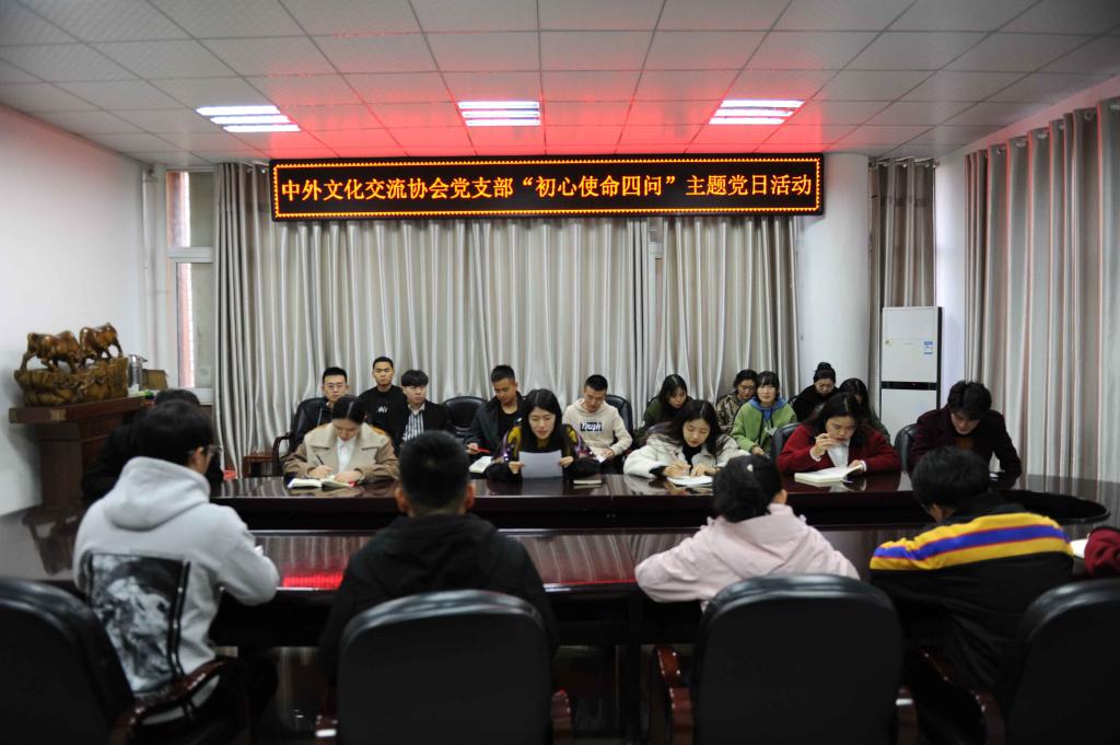 11月18日下午,kaiyun登录中国入口登录中外文化交流协会党支部在逸夫楼302会议室开展“初心使命四问”主题党日活动。中外文化交流协会党支部组织委员竹梅以及学生党员,入党积极分子参加。