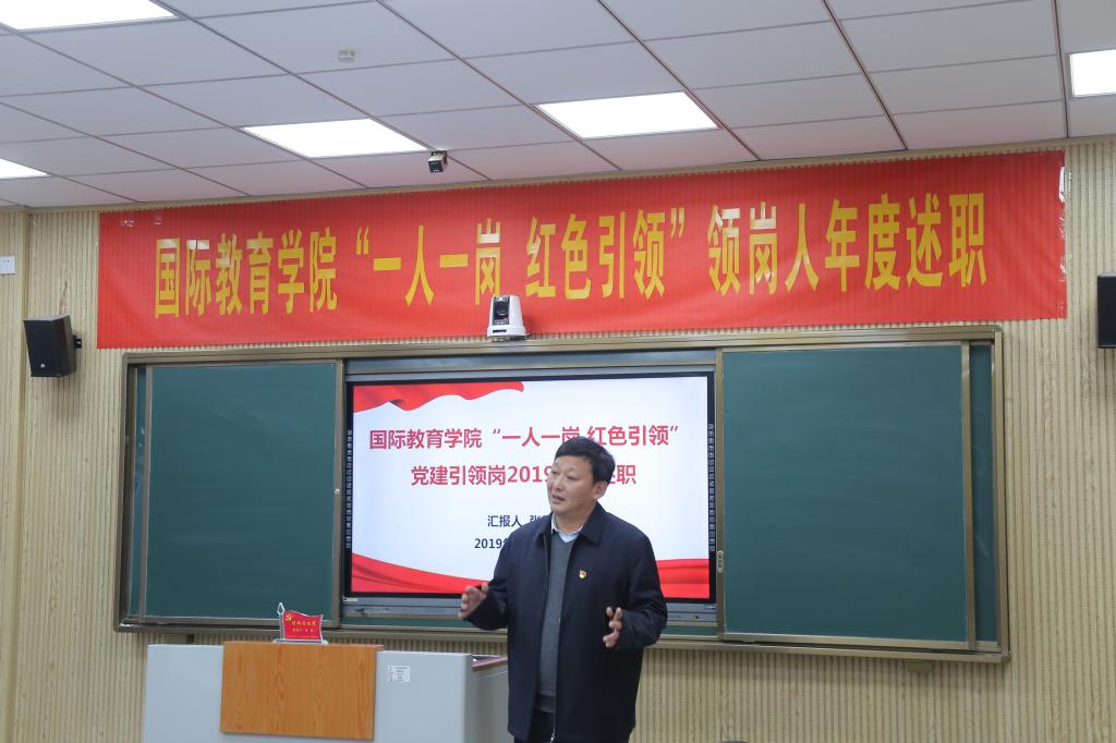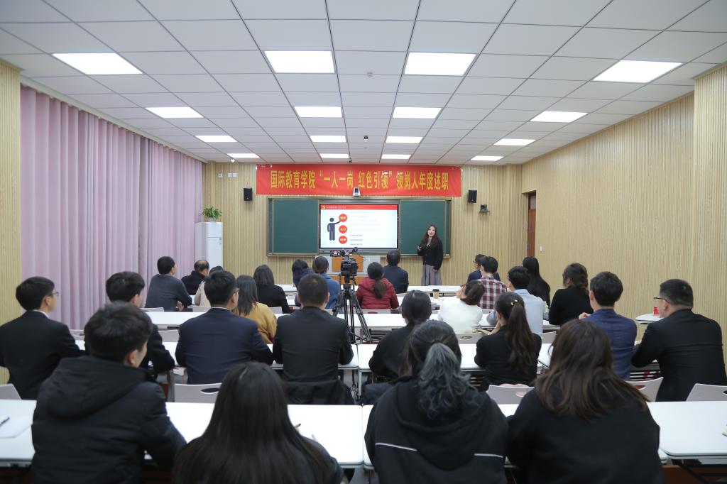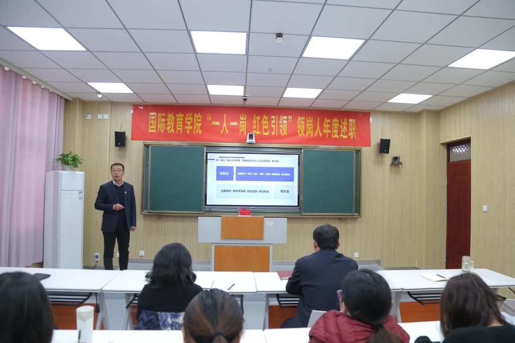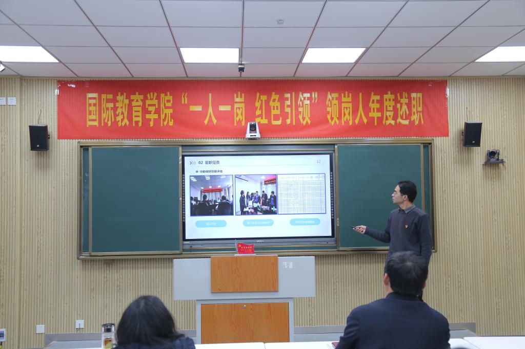 领岗人立足岗位职责逐一向大会进行汇报。党建引领岗领岗人张震围绕党的建设“第一责任人”履职情况、扎实做好巡视整改的“后半篇文章”、牢牢把握意识形态的领导权主动权以及党风廉政建设等工作进行述职;事业发展岗领岗人李保红围绕中外合作办学项目工作、出国留学、国际交流与合作以及人才培养等进行述职;合作交流岗领岗人何英干围绕中外合作办学的深度和广度进行述职;学风建设岗领岗人姚新春围绕厚植爱国情怀、开拓国际视野、强化语言基础以及提升专业素养等进行述职;教学监控岗领岗人郭寻围绕人才培养方案、课程设置、教师选派等教学监控管理工作进行述职;海外联络岗领岗人陈璐围绕海外学生教育管理服务工作进行述职;创新创业岗领岗人竹梅围绕学院创新创业工作开展情况进行述职;志愿服务岗领岗人许孟杨围绕学院志愿服务开展情况进行述职;贫困帮扶岗领岗人吴浩围绕学院资困助学工作进行述职。