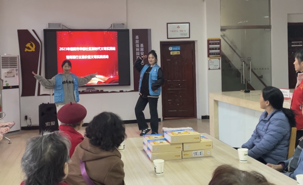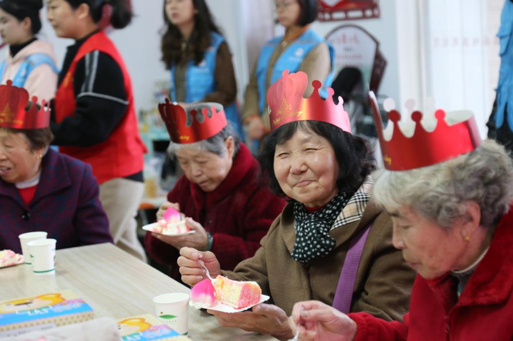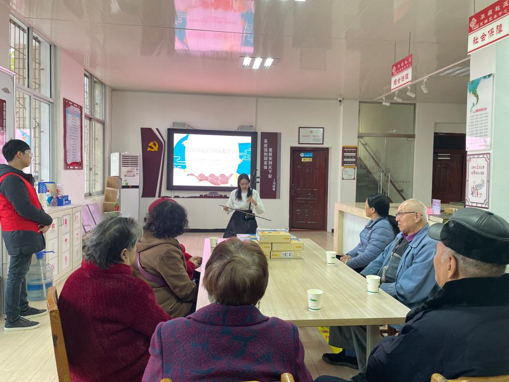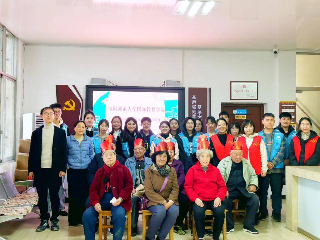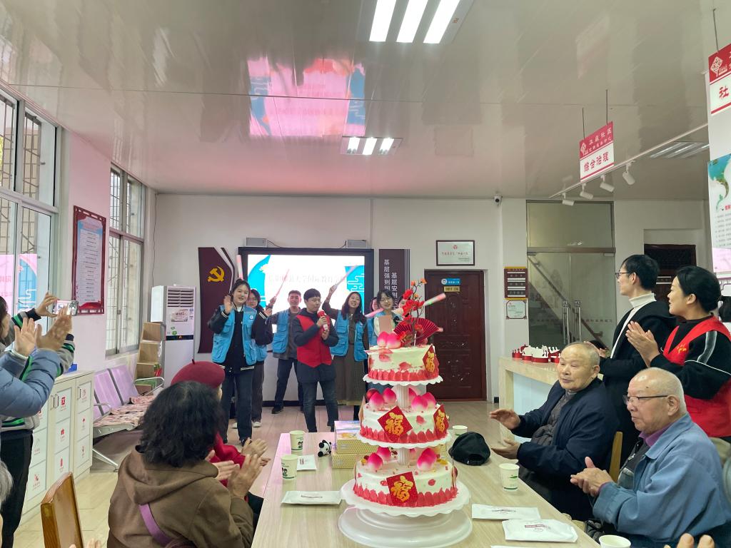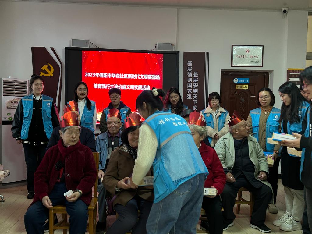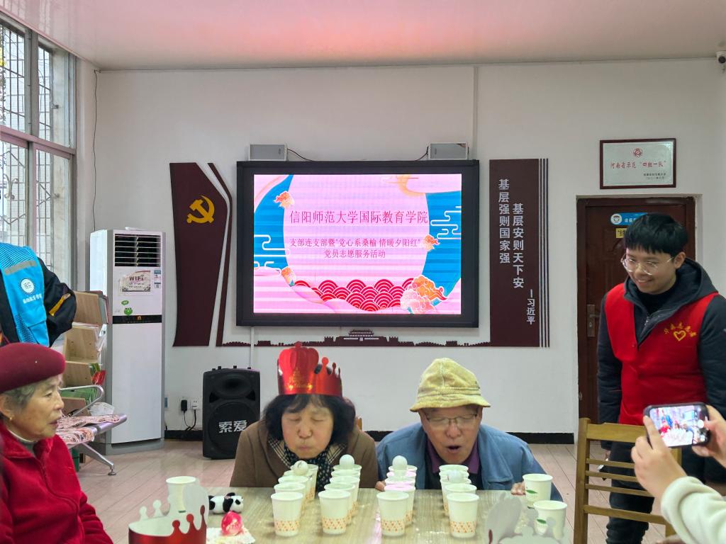 活动在二胡演奏《赛马》中拉开帷幕。会计学专业第一党支部陈怡婕、岳思颖带来的舞蹈《青平果乐园》以动人的舞姿赢得老人们的阵阵掌声;经济学专业第一党支部田留阳、杜怡静以歌曲《我和我的祖国》向从遥远的东北牡丹江迁至大别山革命老区信阳扎根,用辛勤付出为当地工业发展默默奉献的老长辈们致以崇高敬意;互动游戏《吹气球》《碰碰运气》给老人们带来了无限欢乐。最后,党员志愿者们围在老人身边合唱《生日祝福歌》,并为老人们献上了精心准备的礼物。